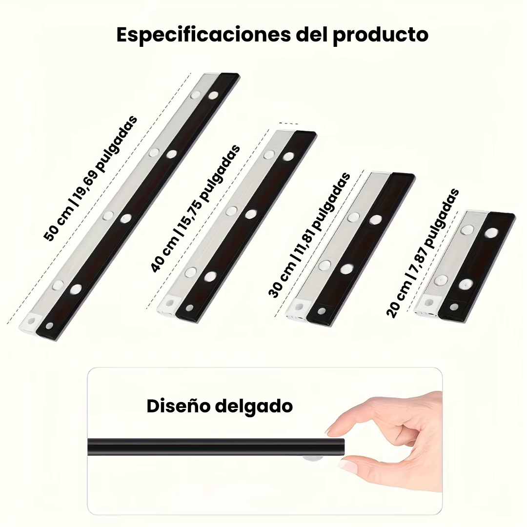 Fabricada con tecnología LED de alta eficiencia y disponible en varias longitudes (20 cm, 30 cm, 40 cm y 50 cm), esta luz combina funcionalidad, elegancia y practicidad. Ideal para iluminar interiores, vitrinas o incluso la cocina.