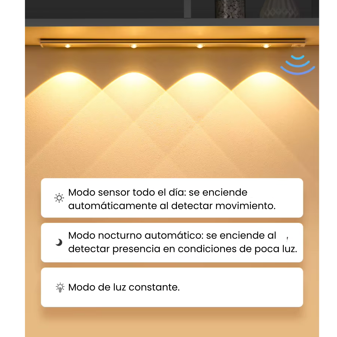 La Symia Sense Light es una barra LED ultradelgada con sensor de movimiento, ideal para iluminar de forma automática tus gabinetes, armarios, pasillos o dormitorios. Su diseño inalámbrico, recargable por USB tipo C, te brinda libertad total: olvídate de cables, clavos o instalaciones complicadas.