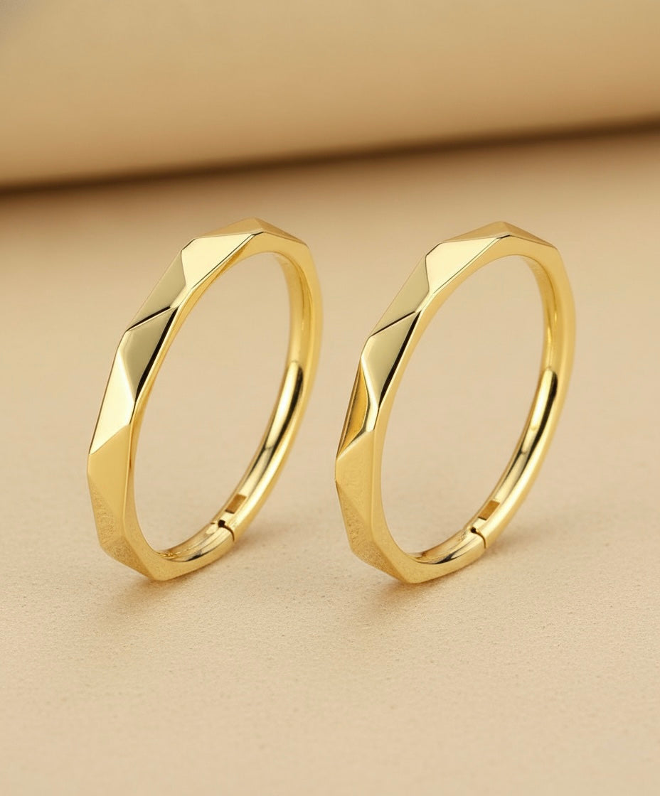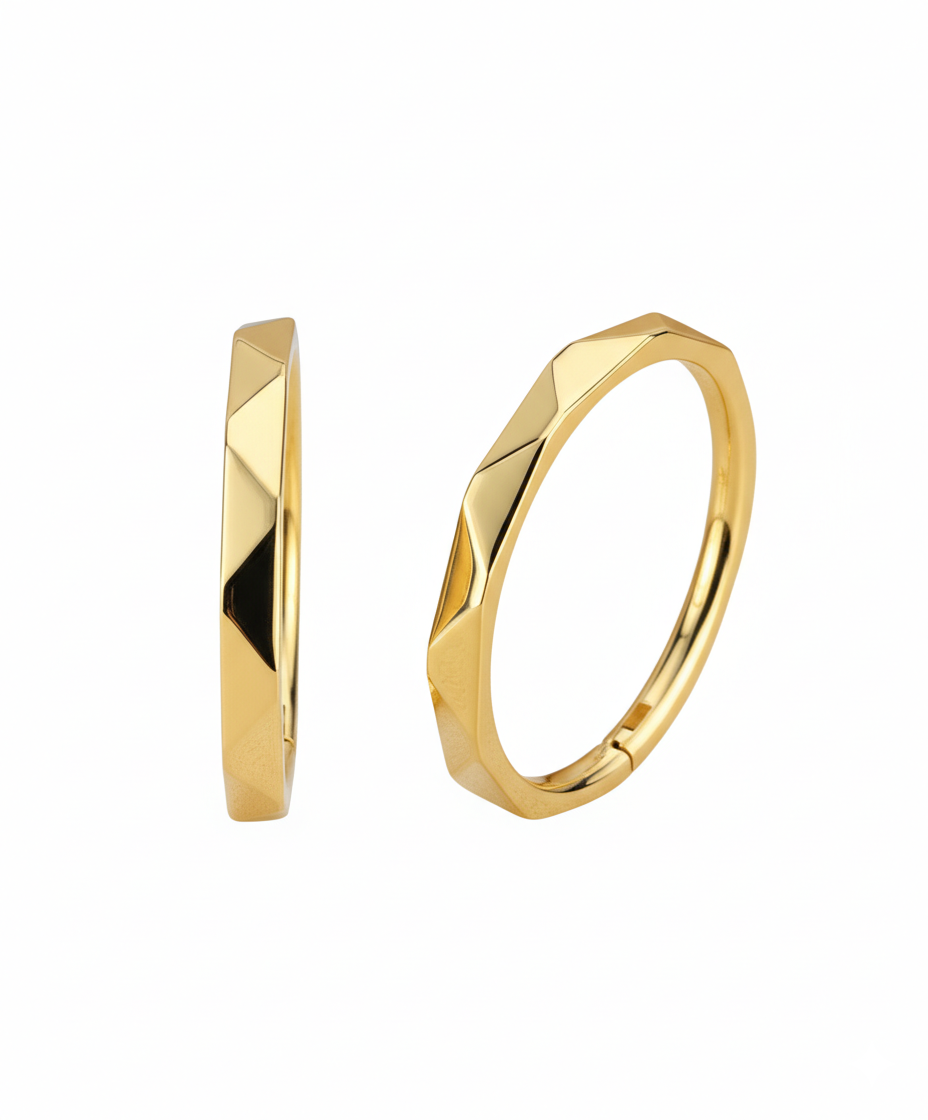 Su diseño tallado en diagonal crea un juego sutil de luces sobre el dorado, aportando dimensión sin perder la esencia minimalista que caracteriza a Symia.