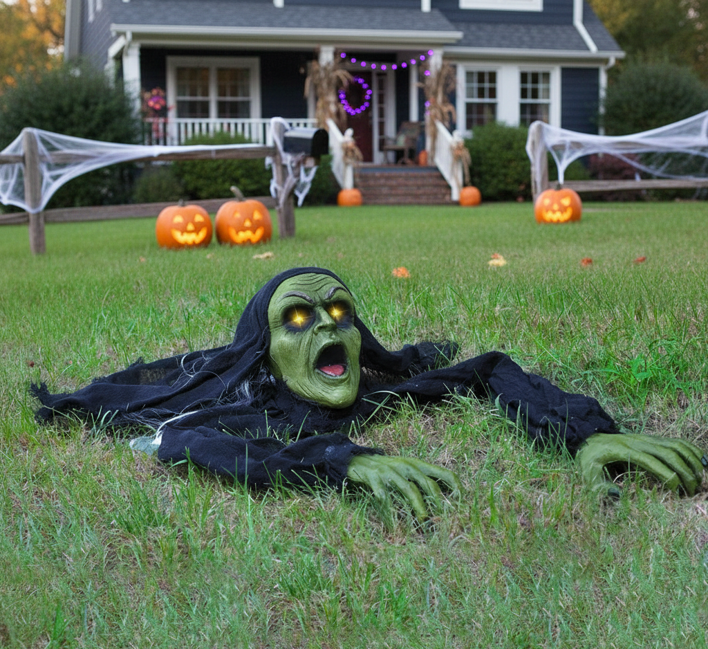 Haz que tu jardín cobre vida (¡y muerte!) con el Zombi Decorativo. Con sus ojos rojos brillantes y sonidos aterradores, este zombi que emerge del suelo será la atracción principal de tu decoración de Halloween.